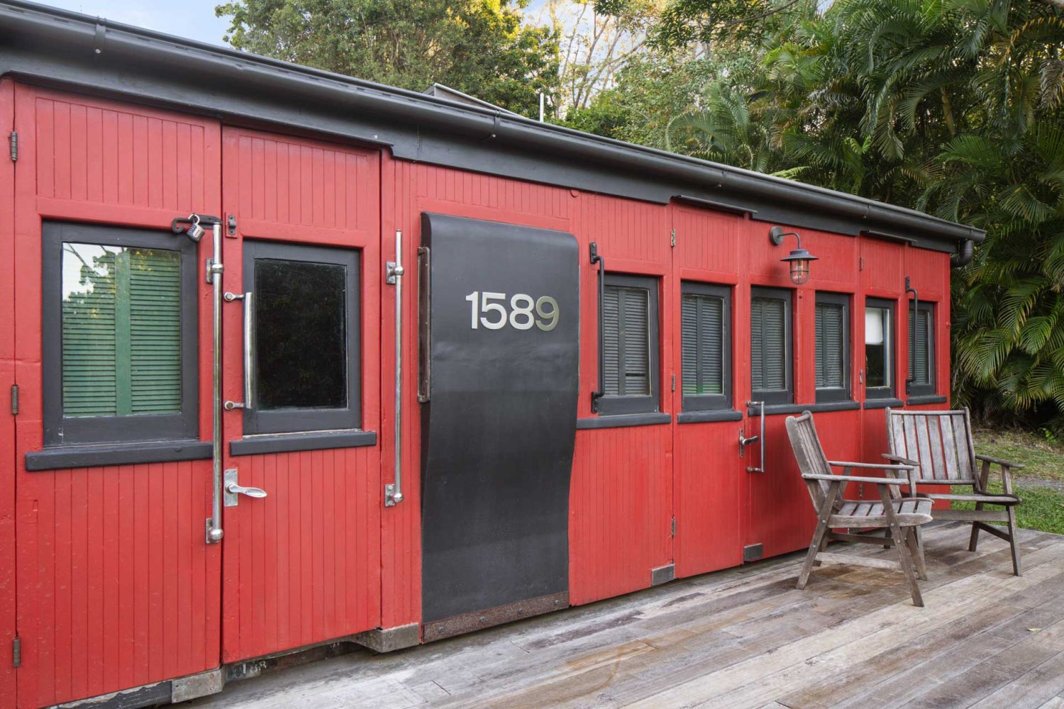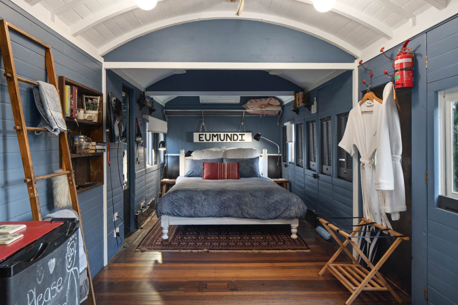 Adding to the uniqueness is a beautifully restored historical train carriage, transformed into a grand sleeper with its own deck and cookout space, set overlooking the tranquil pond.