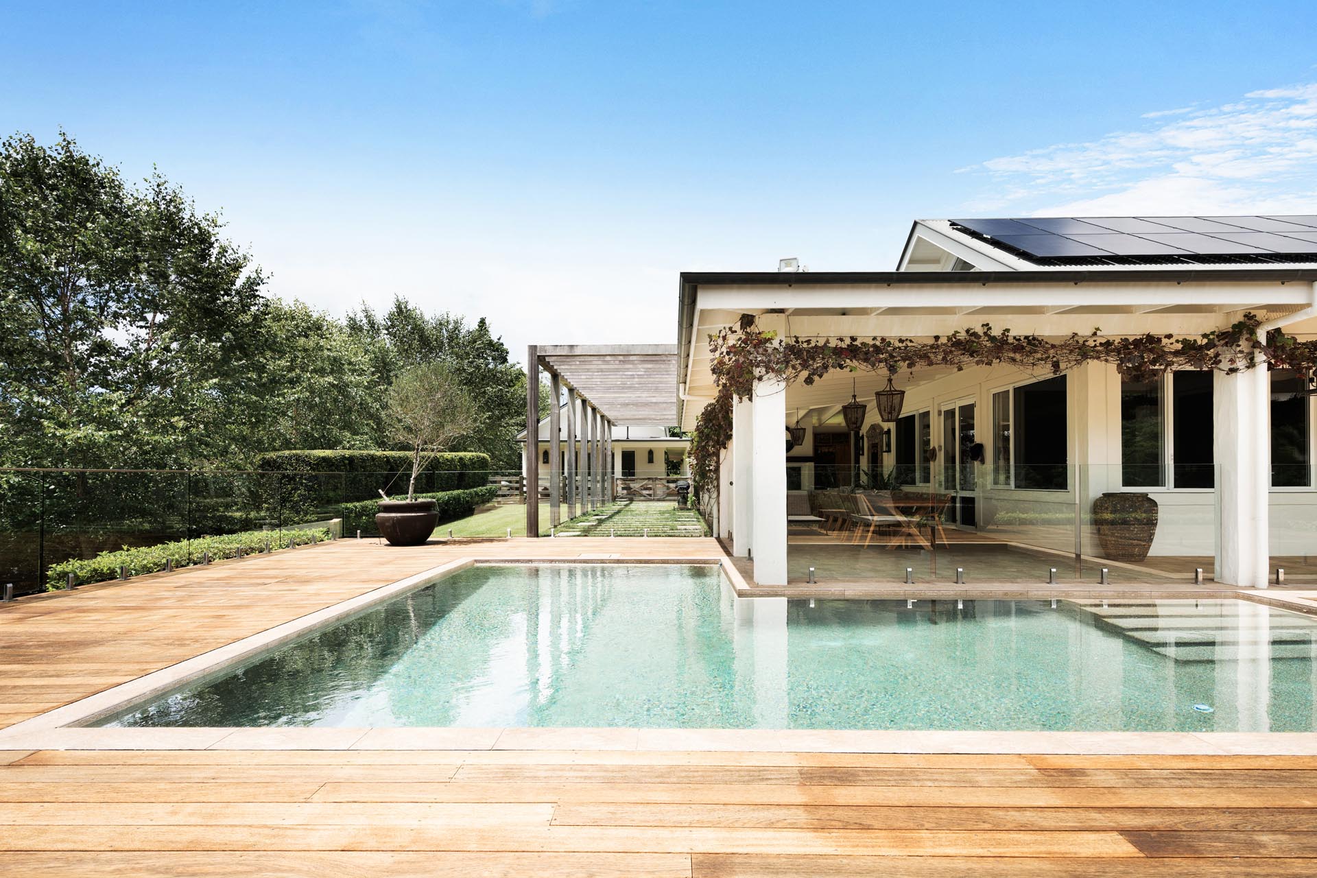 Broad covered terraces wrap the residence, blurring the line between indoors and out, and allowing daily life to unfold in harmony with the landscape. Entertaining is elevated to a private-resort experience. An in-ground swimming pool and hardwood sun deck form the heart of outdoor living, seamlessly connected to the home’s principal living zones. Whether hosting executive gatherings, long-table celebrations, or intimate evenings under the stars, the estate offers scale without compromise.