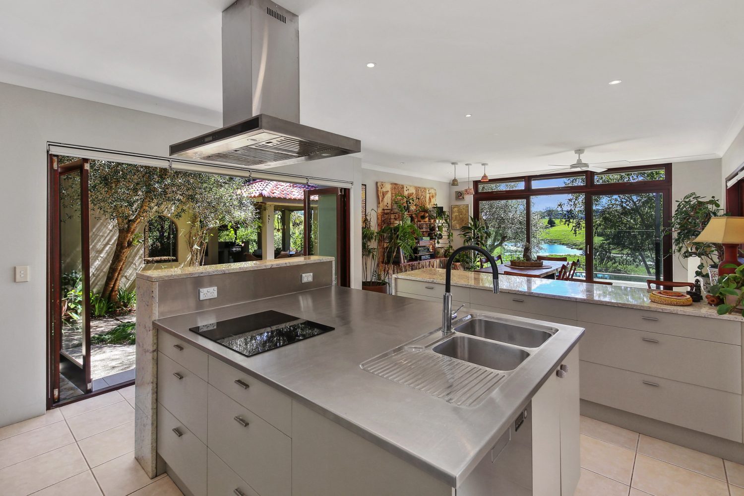 A chef’s kitchen with stainless steel and stone bench tops.